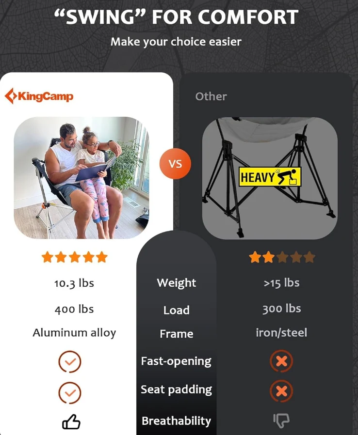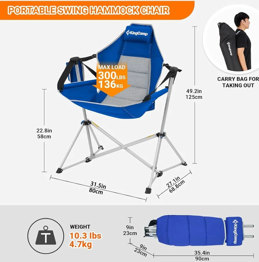 Xarici düşərgə kreslosu 37,8 "X27.1" X27.1 "X49.2", məhdudiyyətsiz və yüksək arxa arxa tərəfi gəzmək üçün geniş yeriniz var. 22.8 "yerdən, sallanan düşərgə kreslosu böyüklər üçün mükəmməldir ayaqları sərbəst.