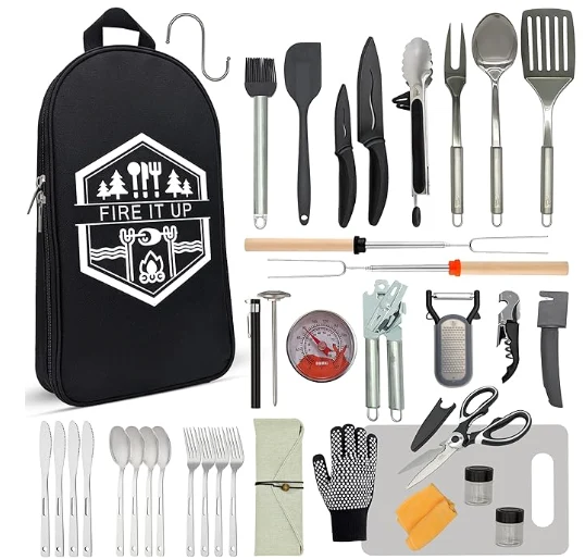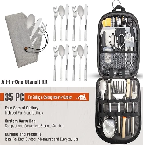 Xarici düşərgə qabları saxlama çantası Bu 35 pc düşərgə bişirmə qabları dəsti, açıq yemək ehtiyaclarınız üçün tam bir həlldir. Buraya bir düşərgə mətbəx dəsti və düşərgə qabları bişirmə dəsti daxildir, hamısı səliqəli şəkildə əlavə bölmə və iki arxa cib ilə xüsusi bir çantaya yığılır. Set, bütün düşərgənizi bişirmə zərifliyinizi təmin etmək üçün hazırlanmışdır, onu düşərgə qurğusuna əvəzsiz bir əlavə hala gətirir