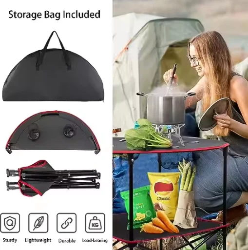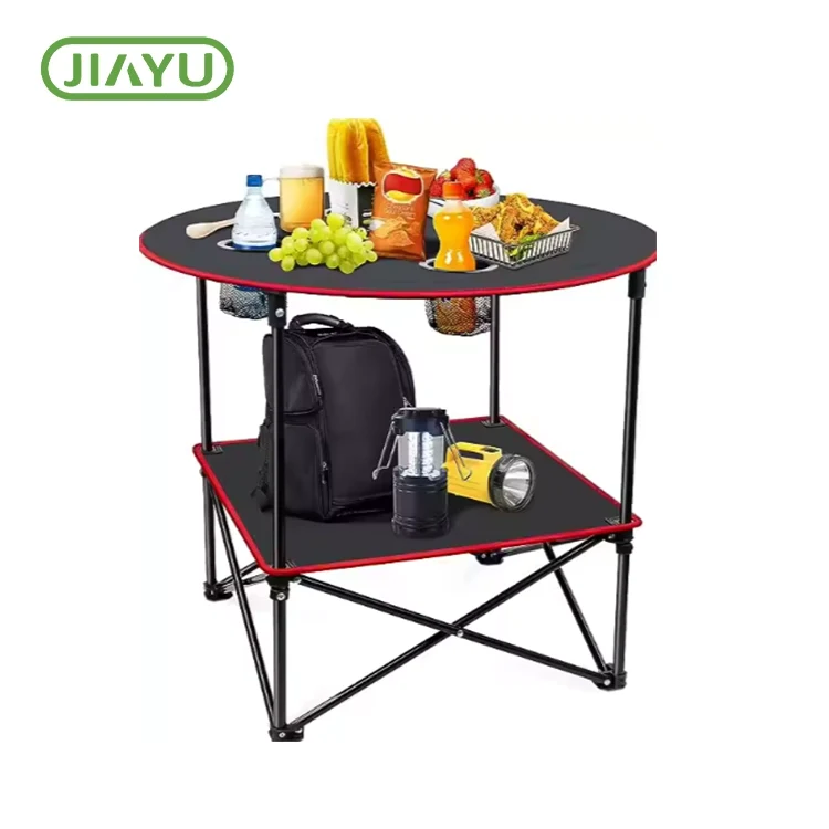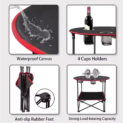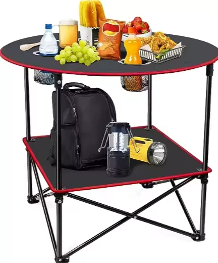 Xarici yemək çimərlik masası. Qatlanan kvadrat kətan masa yalnız qapalı, həm də düşərgə, balıqçılıq, gəzinti, çimərlik, gəzinti, bbq, piknik, bbq, pişirmə üçün, popcorn, fiş, çiplər, daldırma və ya digər qəlyanaltılar üçün istifadə edilə bilməz , Açıq fəaliyyətlər zamanı qəlyanaltı edən düymələr və s. Kaş və s. Cədvəlin ən yüksək səviyyəsində, yemək saxlamaq üçün əlavə yer üçün başqa bir pillə var.