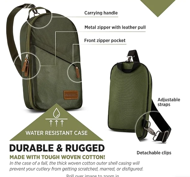 Portativ açıq düşərgə alət çantası. Birdən çox bölmə var, buna görə düz qablar möhkəm qalır və nəqliyyat zamanı fırlatmır. Bir düşmə halında, qalın toxunmuş pambıq xarici qabıq qabığınız, bıçağınızın cızılmadan, əridi və ya pozulmasının qarşısını alacaqsınız .. Qatlanan, çanta rahat səyahət baqajına, magistral və ya əl tuta bilər (sapı quraşdırılmış). Qabyuyan maşın təhlükəsizdir və asanlıqla təmizlənir və yuyucu dostudur. Parlaq bir dizaynla mühəndis, standart saxlama yerlərində asanlıqla uzaqlaşır