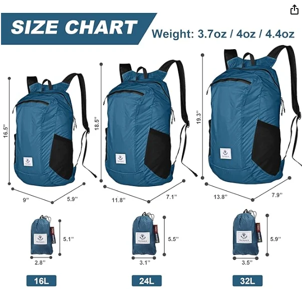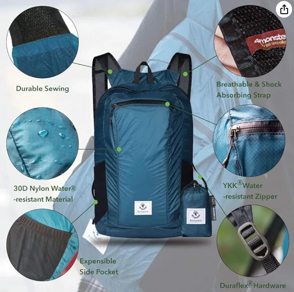 Suya davamlı yüngül yürüyüş sırt çantası, Qatlanan Sırt çantası açıq səyahət, düşərgə, gəzinti, gün gəzintiləri və alış-veriş üçün kifayət qədər yer təmin edir. Əsas fermuar cibi, ön fermuar cibi və iki mesh tərəfi pixet ilə gəlir. 30 gün əngəl Qayıdır / Pulsuz Birja, 12 ay zəmanət.